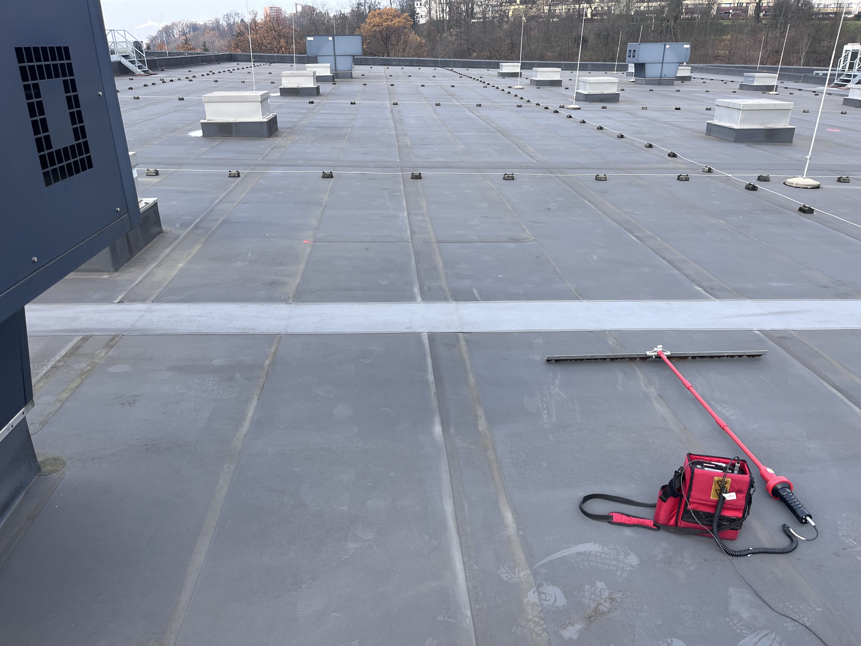 To umožňuje provést jiskrovou zkoušku, která naprosto spolehlivě odhalí netěsnosti díky průchodu elektrického napětí trhlinou (až 55 kV) v hydroizolaci ke konstrukci střechy uzemněné na vodivý element. Zkouška je určena pro fólie, povlaky a povrchy o tloušťce od 0,064 do 25,6 mm.
